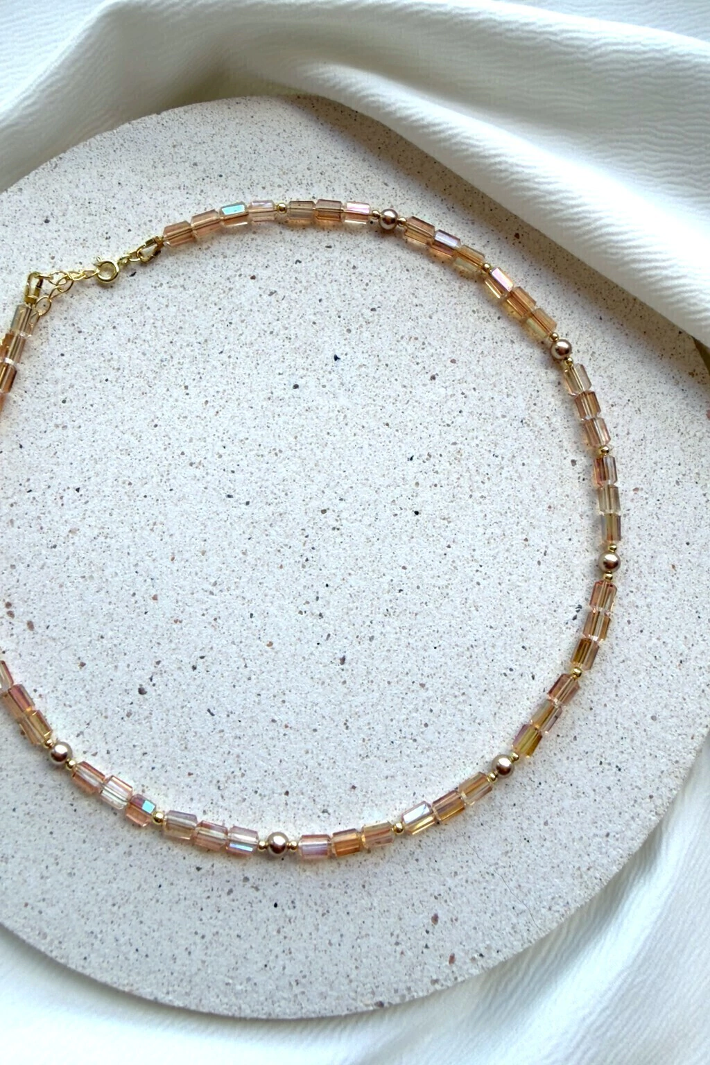 Choker com cristais de vidro irizados em formato canutilho multifacetado, que refletem a luz com brilho intenso e sofisticado, combinados à Pérola Shell Glass dourada.